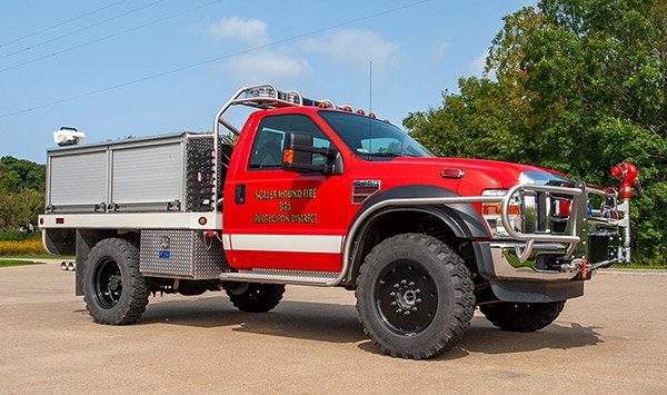 Brush Truck 943 is a type 6 wildland engine equipped with a 300 gallon water tank, a cab-controlled monitor (externally mounted nozzle), wildland tools, and forestry handlines. 943 can engage uncontrolled fires in fields, greenspace, prairie and forests. The truck can also assist refilling tankers from ponds, lakes, and other reservoirs during structural firefighting operations.
